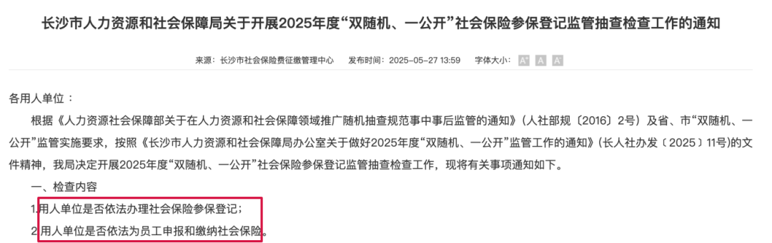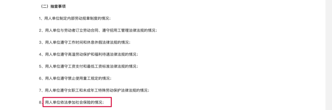 抽检内容均提到:需检查用人单位是否依法为员工申报和缴纳社会保险。
