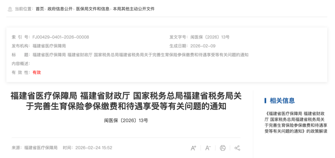 福建省发布《关于完善生育保险参保缴费和待遇享受等有关问题的通知》。
