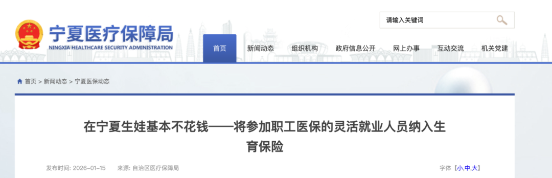 宁夏医保局发布通知,明确自2026年1月1日起,正式将参加职工医保的灵活就业人员全面纳入生育保险覆盖范围。