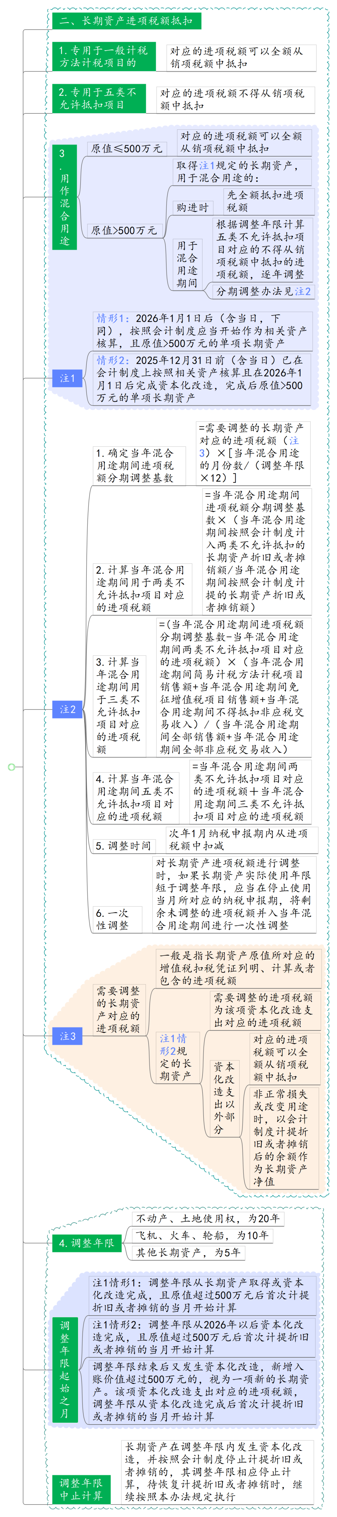 注1:原值超过500万元的单项长期资产,购进时先全额抵扣进项税额,此后在用于混合用途期间,根据调整年限计算五类不允许抵扣项目对应的不得从销项税额中抵扣的进项税额,逐年调整。