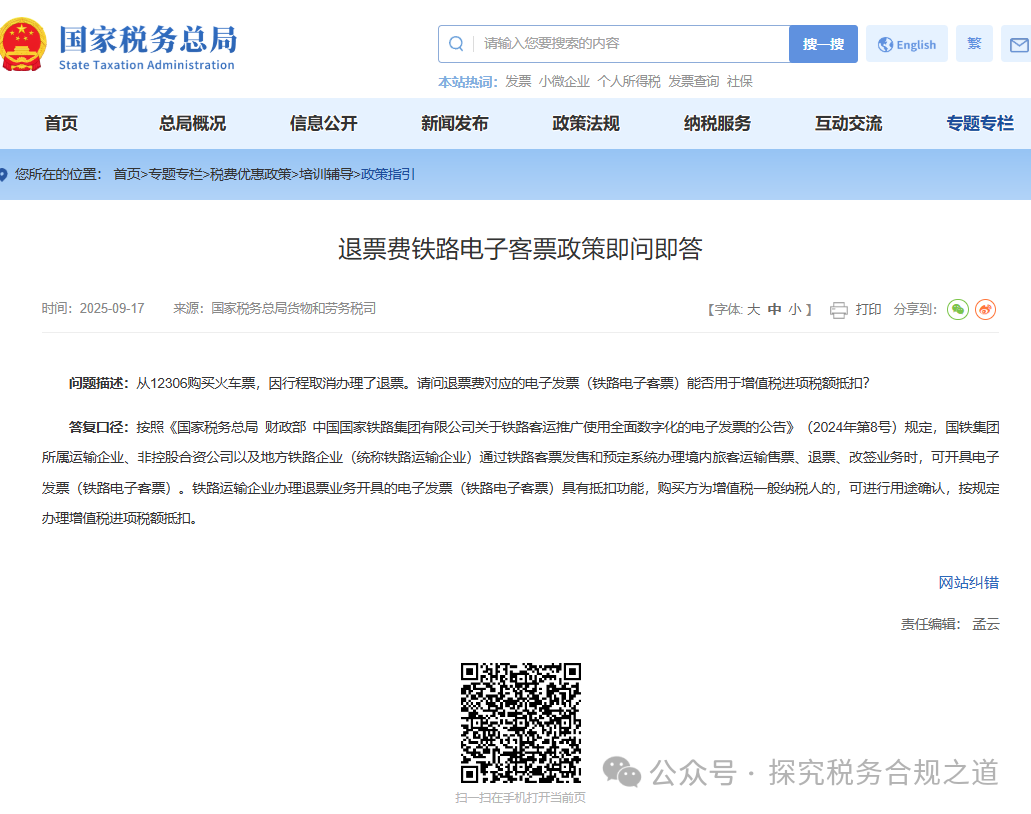 答复口径:按照《国家税务总局 财政部 中国国家铁路集团有限公司关于铁路客运推广使用全面数字化的电子发票的公告》(2024年第8号)规定,国铁集团所属运输企业、非控股合资公司以及地方铁路企业(统称铁路运输企业)通过铁路客票发售和预定系统办理境内旅客运输售票、退票、改签业务时,可开具电子发票(铁路电子客票)。铁路运输企业办理退票业务开具的电子发票(铁路电子客票)具有抵扣功能,购买方为增值税一般纳税人的,可进行用途确认,按规定办理增值税进项税额抵扣。