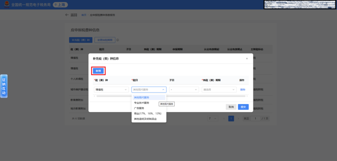 完成行业信息变更后,返回“应申报税费种信息报告”模块,点击“新增”按钮,根据新增的行业信息补充相应的税费种认定。