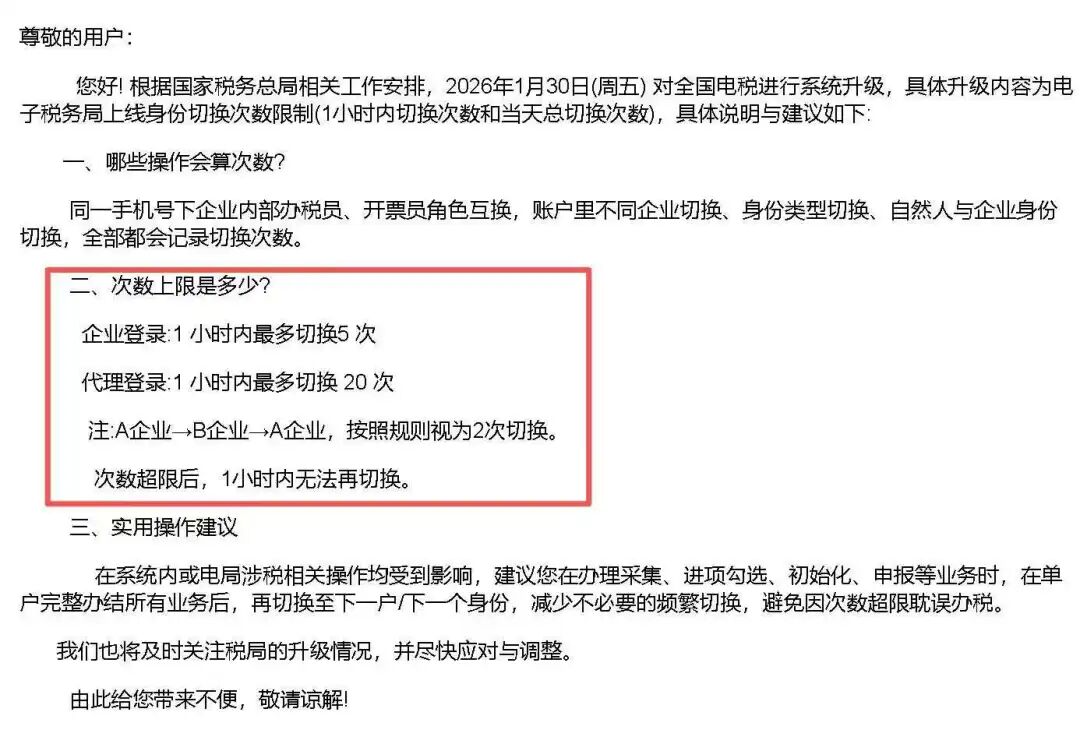 2026年1月30日起,电子税务局限流,企业账号1小时最多切换5次,代理账号1小时最多切20次。