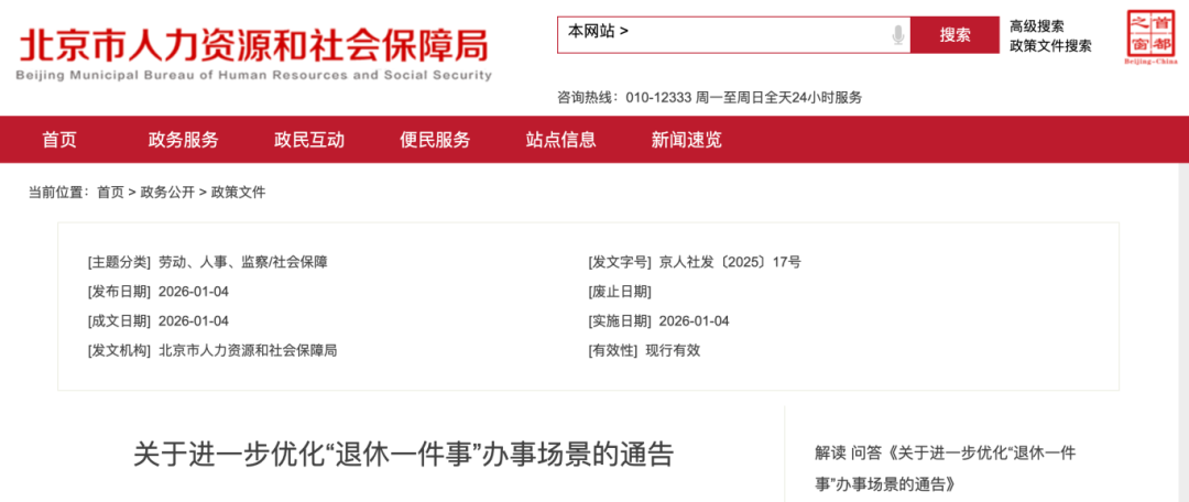 1月4日,北京市人力资源和社会保障局发布《关于进一步优化“退休一件事”办事场景的通告》。