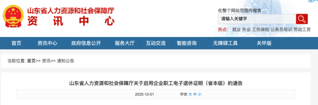 2025年12月1日,山东省人社厅发布《关于启用企业职工电子退休证明(省本级)的通告》。