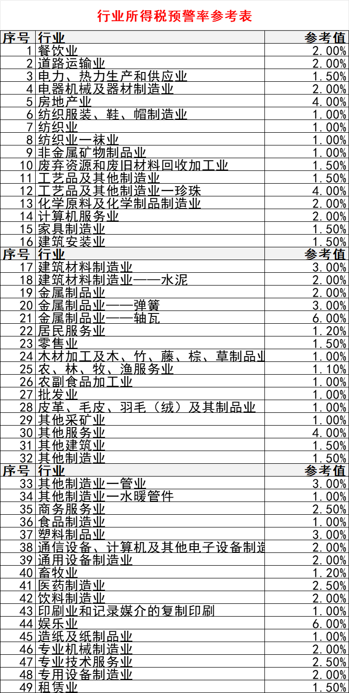 2026年各行业的“预警税负率”