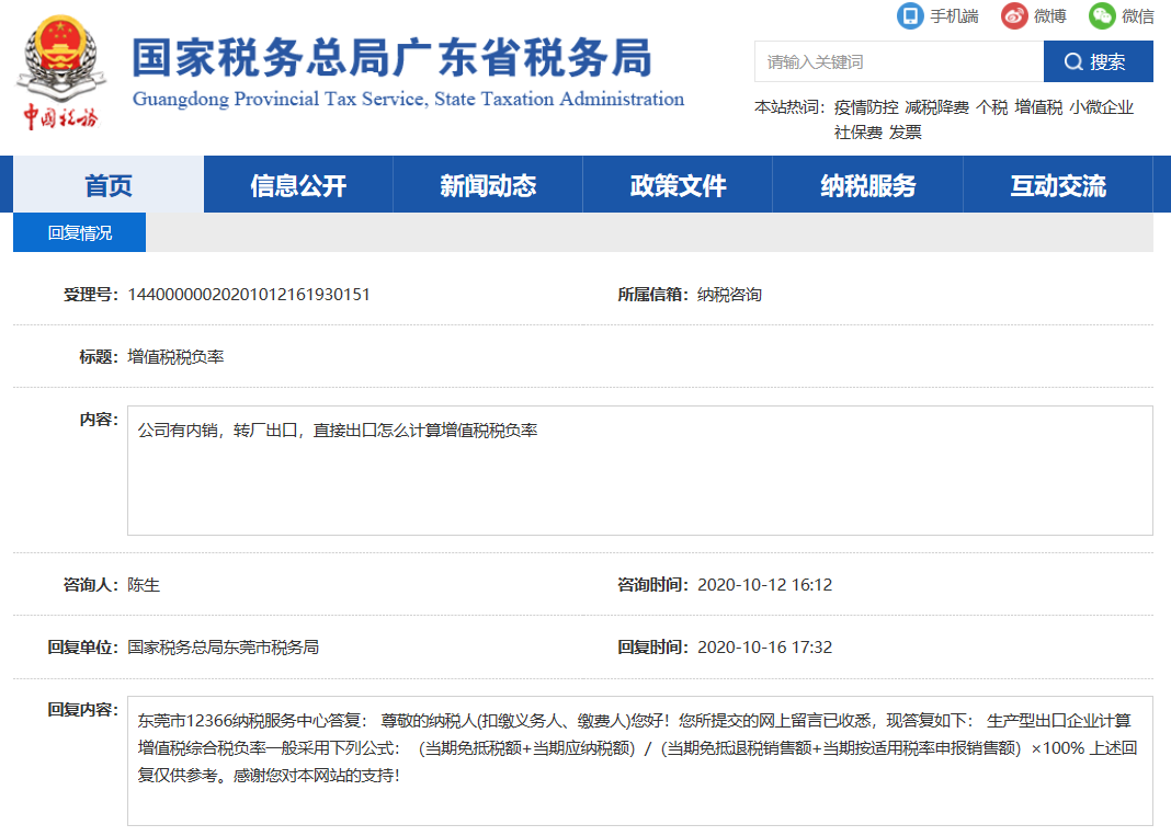 东莞市12366纳税服务中心答复:生产型出口企业计算增值税综合税负率一般采用下列公式:(当期免抵税额+当期应纳税额)/(当期免抵退税销售额+当期按适用税率申报销售额)×100%