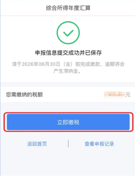 2、补税:跳转到缴税页面,点击【立即缴税】,选择支付方式完成缴款,务必在6月30日前缴清,避免逾期。