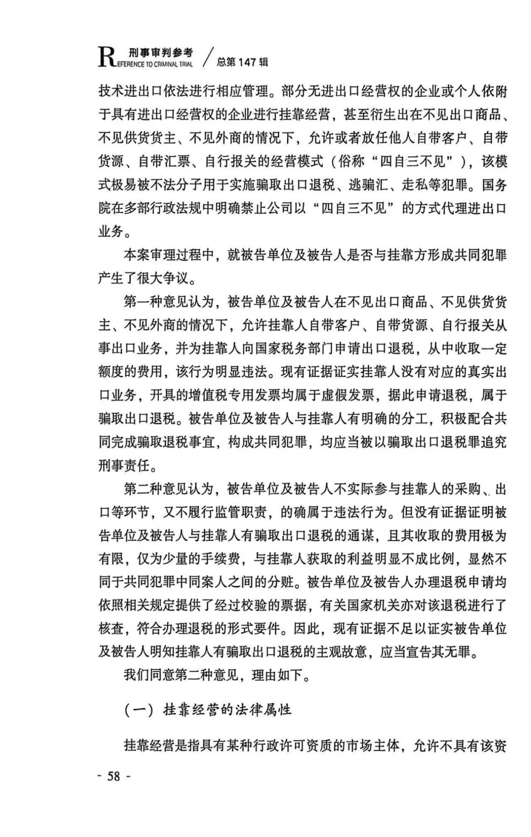 “四自三不见”,本质上属于真实出口方挂靠外贸企业经营,外贸企业以自营名义出口并申请退税,退税后分享退税款的违规经营模式。采用“四自三不见”违规经营模式,真实出口方构成骗取出口退税罪的,外贸企业是否必然构成骗取出口退税罪的共犯?最高法出版的《刑事审判参考》(总第147辑,第1674号)对此作出回应。