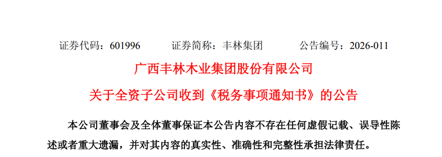 2026年4月16日,广西丰林木业集团股份有限公司(以下简称“丰林集团” 或“公司”)全资子公司广西钦州丰林木业有限公司(以下简称“钦州丰林”)收 到主管税务机关国家税务总局钦州市钦南区税务局第二税务分局(以下简称“税 务机关”)出具的《税务事项通知书》(钦南税二分通〔2026〕888号),现将有关 情况公告如下: