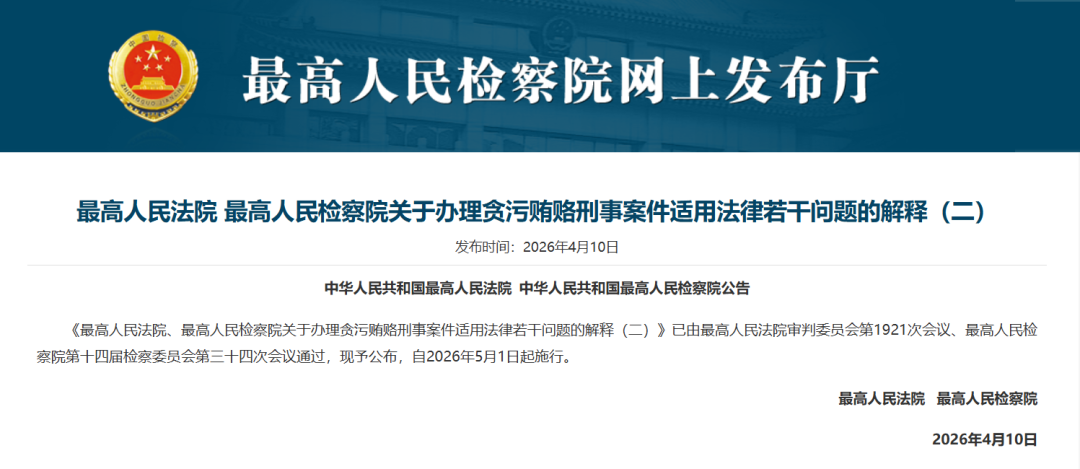 2026年4月10日,最高法、最高检联合发布了一个新司法解释,全称叫《关于办理贪污贿赂刑事案件适用法律若干问题的解释(二)》,从今年5月1日起正式施行。