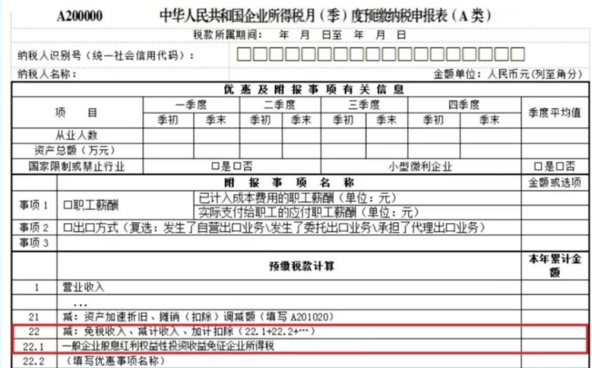 若企业在年度内存在预缴申报,还需在预缴申报时通过《中华人民共和国企业所得税月(季)度预缴纳税申报表(A类)》(A200000表)第7行“减:免税收入、减计收入、加计扣除”填报相应优惠事项。
