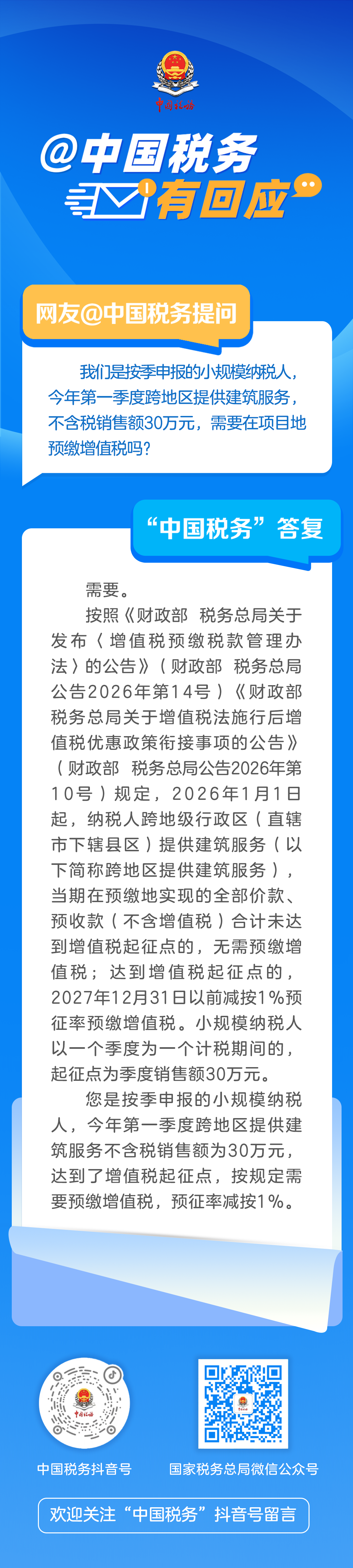 @中国税务有回应丨小规模纳税人一季度跨地区建筑服务不含税销售额30万元,需要在项目地预缴增值税吗?