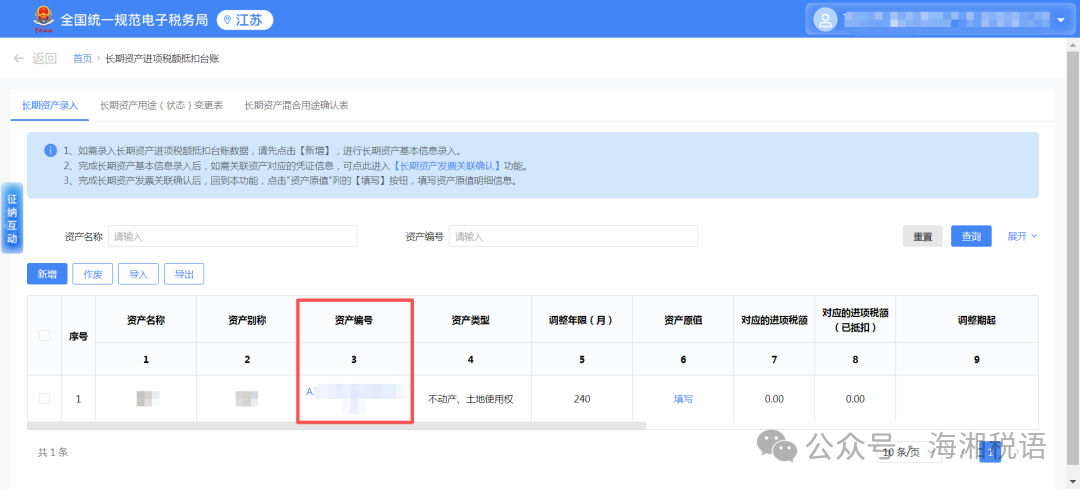您是否拥有原值超过500万元的单项长期资产?根据政策规定,这类资产需要设置专门的进项税额抵扣台账,记录取得、使用、处置及抵扣情况。为帮助您规范管理、准确申报,“苏州税舒心”服务团队为您梳理了长期资产进项税额抵扣台账的全流程操作指引,从信息录入到发票关联,一步一图,轻松掌握。