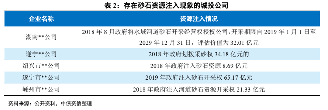 中债资信在调研中发现,湖南、四川、浙江等地存在地方政府将砂石资源注入城投公司的情况。砂石开采权属于未来的收益权,因此政府将其注入城投公司在资产端计入“无形资产”,权益端计入“资本公积”,后续由城投公司的下属砂石开采类子公司进行运营管理。通过此种注资,可以快速提升城投公司的资产规模和营业收入,改善现金流,降低债务负担。