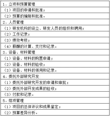研究开发业务流程通常包括下列主要活动:立项和预算管理,人员管理,设备、材料管理,委托外部研究开发管理,以及结项管理。