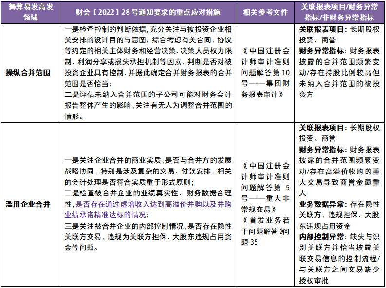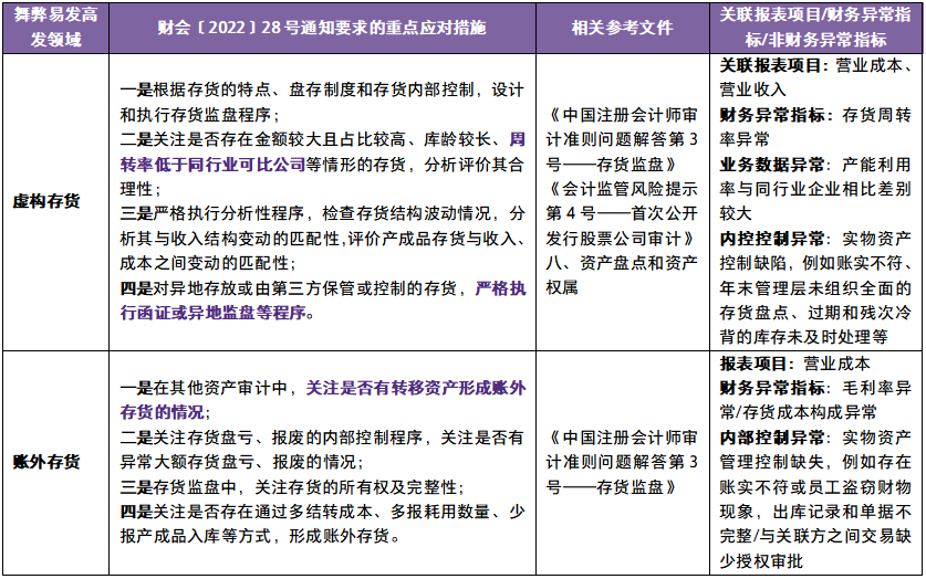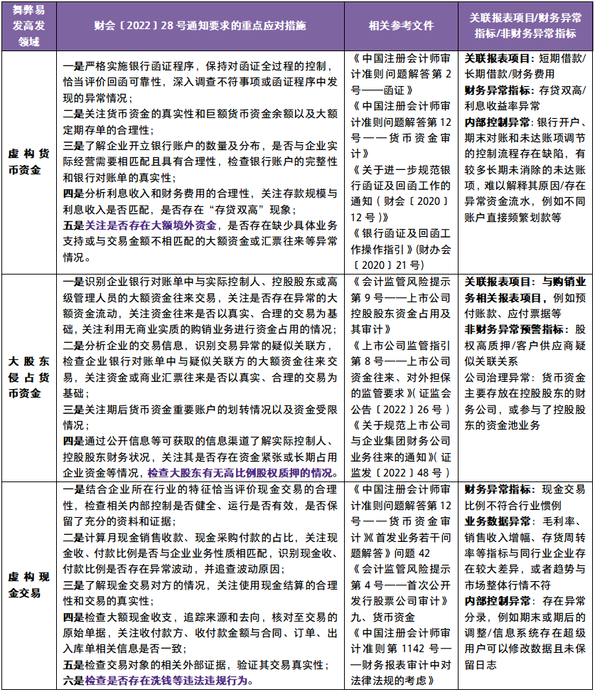 财会〔2022〕28号通知附件列举了货币资金、存货、在建工程和购置资产、资产减值、收入、境外业务、企业合并、商誉、金融工具、滥用会计政策和会计估计、关联方关系及交易等11个财务舞弊易发高发领域及重点应对措施。致同结合实务中的案例,将舞弊高发领域对应的常见舞弊迹象和审计程序注意事项整理如下: