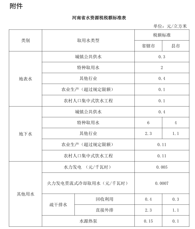 一、全省水资源税具体适用税额按照本通告所附《河南省水资源税税额标准表》执行。
