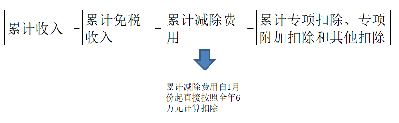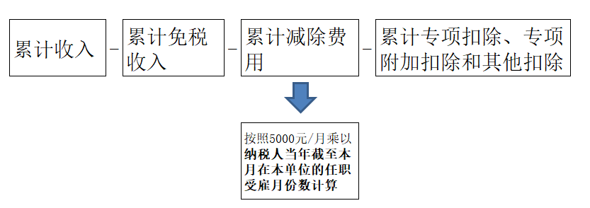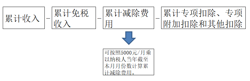 累计预扣预缴应纳税所得额=累计收入-累计免税收入-累计减除费用-累计专项扣除-累计专项附加扣除-累计依法确定的其他扣除