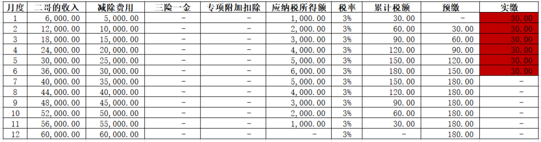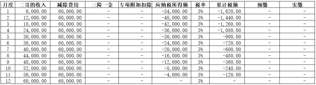 这里的减除费用就是按照二哥在公司的任职受雇月份来累算的。