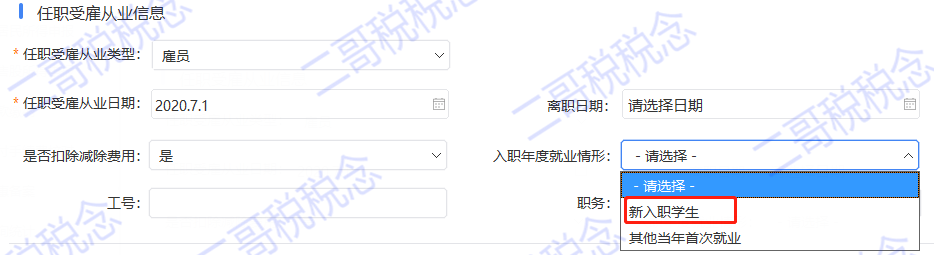 在增加人员信息时候,入职年度就业情况要选择,这里分了两种,都代表首次就业的情况,也就是政策规定的,一个纳税年度内首次取得工资、薪金所得的居民个人。