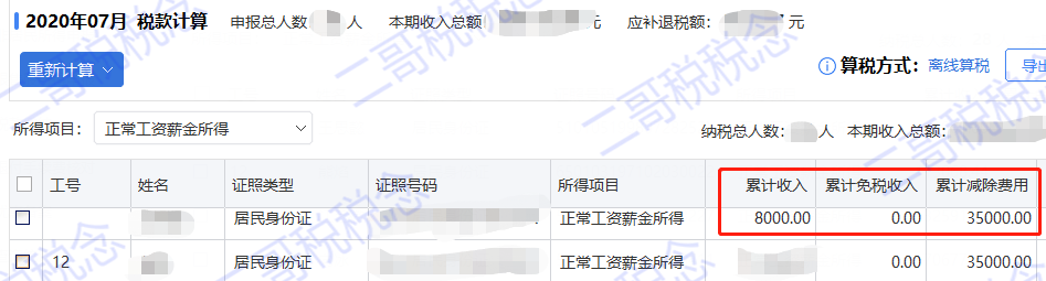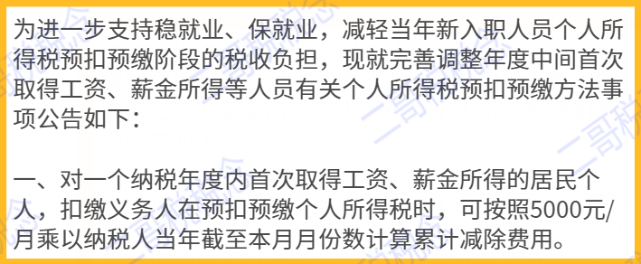 这个和第一种是不同的,比如二哥是7月入职,按一般情况7月发放工资只能扣1个月的5000,而现在情况是可以让你扣7*5000的减除费用。