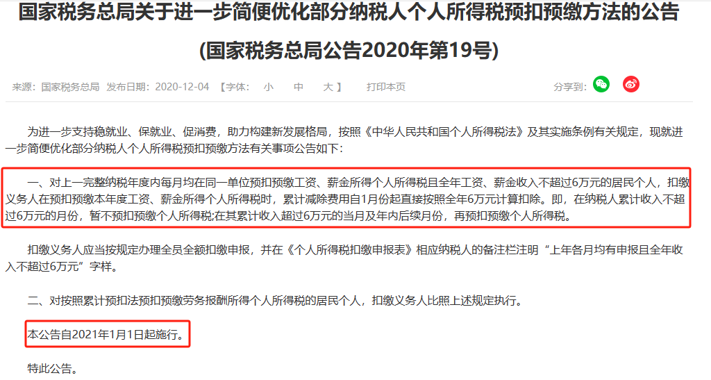 依据:国家税务总局公告2020年第19号 国家税务总局关于进一步简便优化部分纳税人个人所得税预扣预缴方法的公告