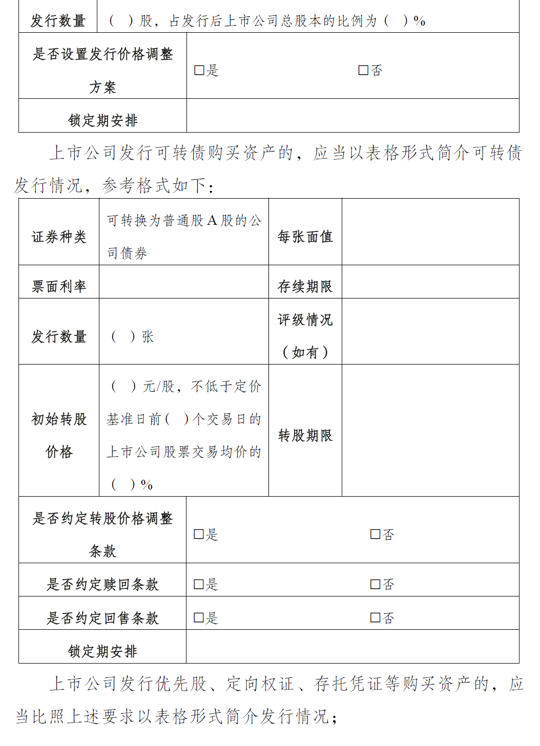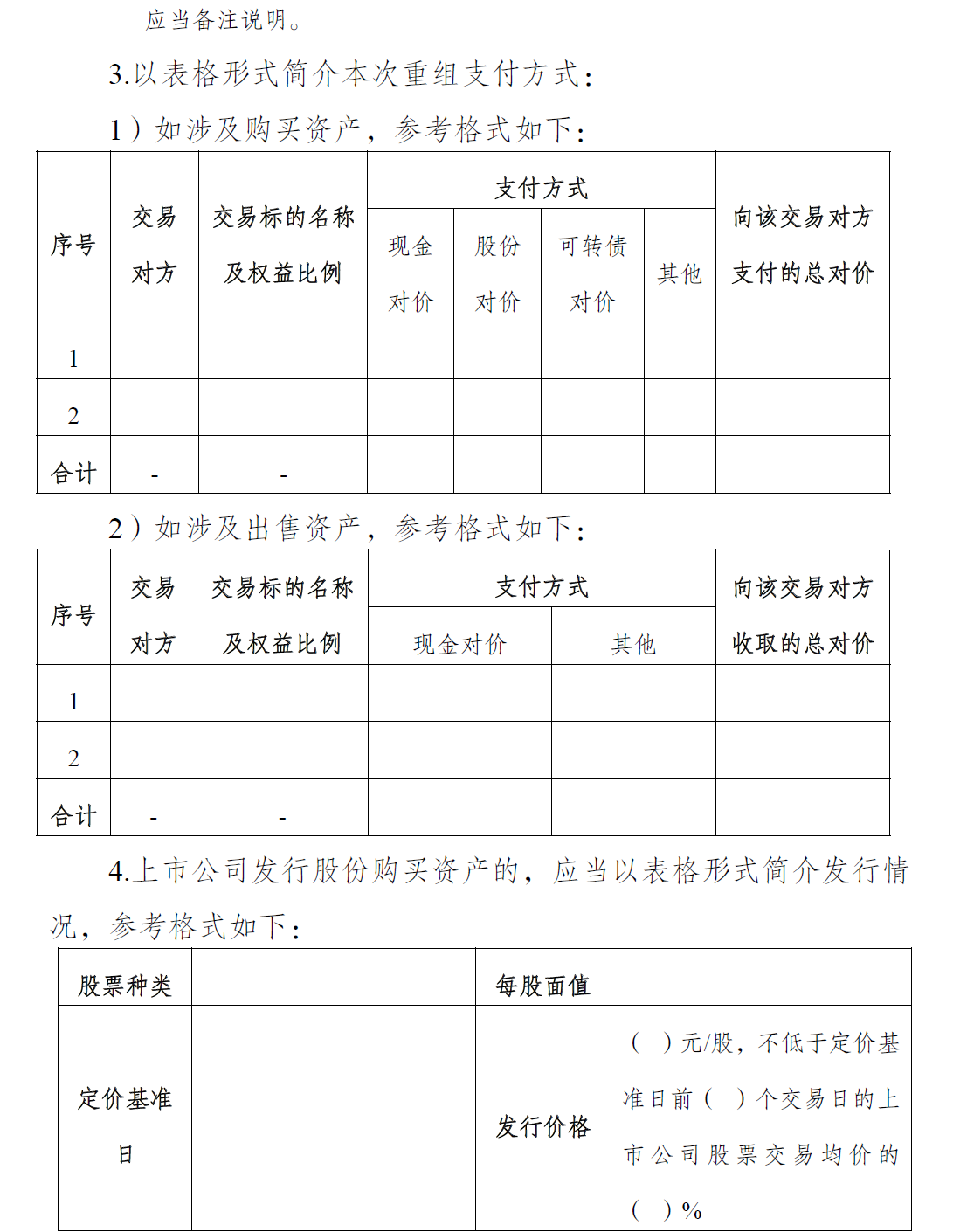 (七)重组支付方式情况。上市公司支付现金购买资产的,应当披露资金来源。上市公司发行股份购买资产的,应当披露发行股份的定价及依据、本次发行股份购买资产的董事会决议明确的发行价格调整方案等相关信息。上市公司通过发行优先股、向特定对象发行可转换为股票的公司债券(以下简称可转债)、定向权证、存托凭证等购买资产的,应当比照前述发行股份的要求披露相关信息。