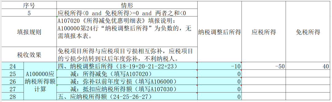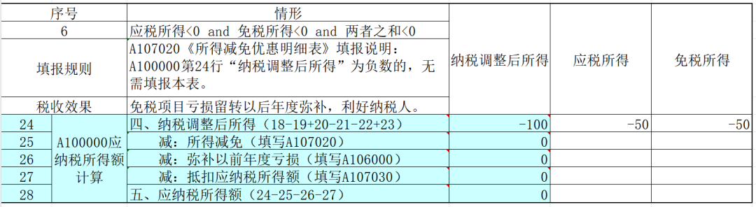 6、在“应税所得<0 and 免税所得<0 and 两者之和<0”的情形下,根据填报规则“A100000第24行“纳税调整后所得”为负数的,无需填报本表。”,税收效果为“免税项目亏损留转以后年度弥补,利好纳税人。”