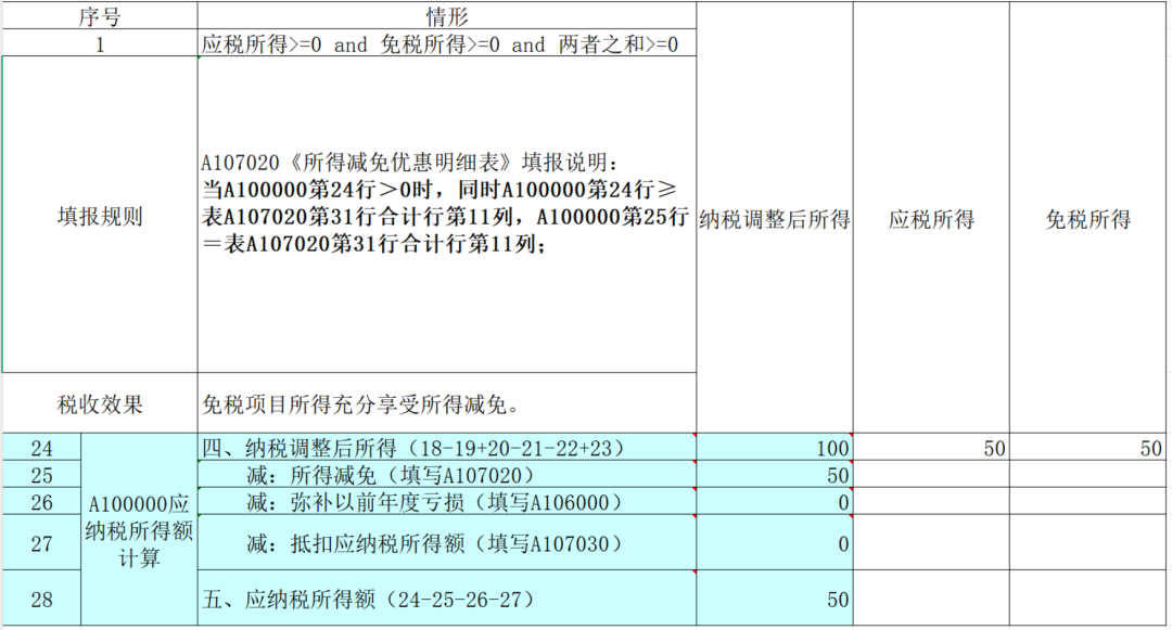 1、在“应税所得>=0 and 免税所得>=0 and 两者之和>=0”的情形下,根据填报规则“当A100000第24行>0时,同时A100000第24行≥表A107020第31行合计行第11列,A100000第25行=表A107020第31行合计行第11列”填列,税收效果为“免税项目所得充分享受所得减免。”