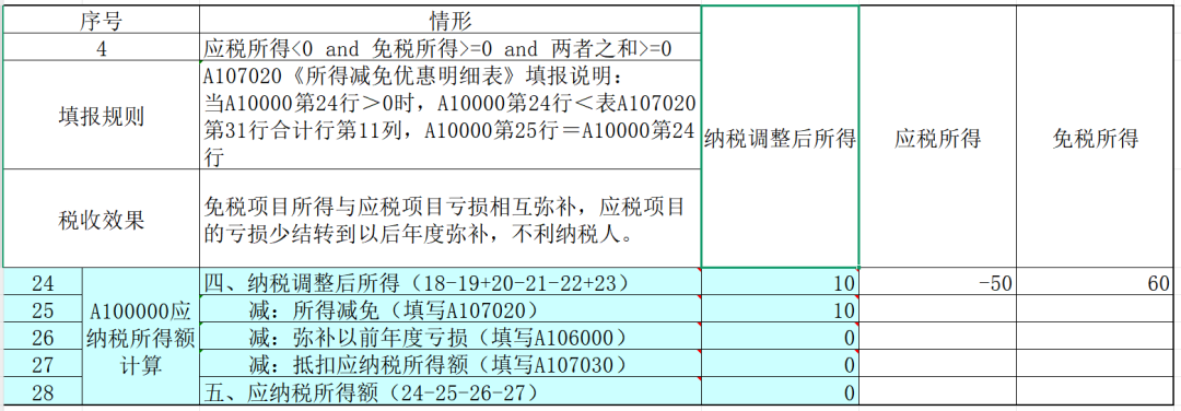 4、在“应税所得<0 and 免税所得>=0 and 两者之和>=0”的情形下,根据填报规则“当A10000第24行>0时,A10000第24行<表A107020第31行合计行第11列,A10000第25行=A10000第24行”填列,税收效果为“免税项目所得与应税项目亏损相互弥补,应税项目的亏损少结转到以后年度弥补,不利纳税人。”