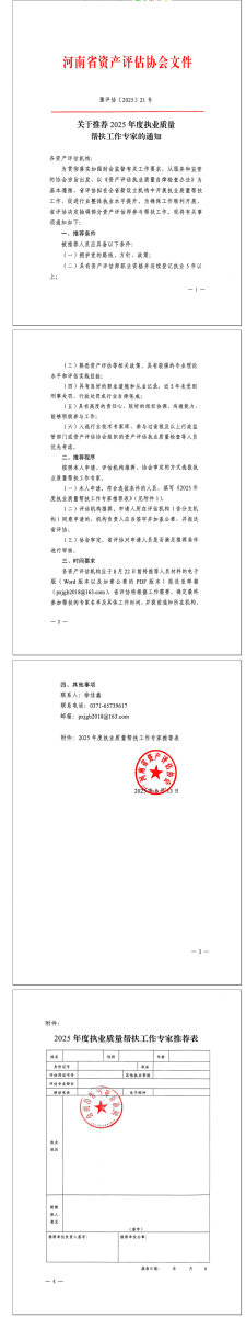 河南省资产评估协会关于推荐2025年度执业质量帮扶工作专家的通知