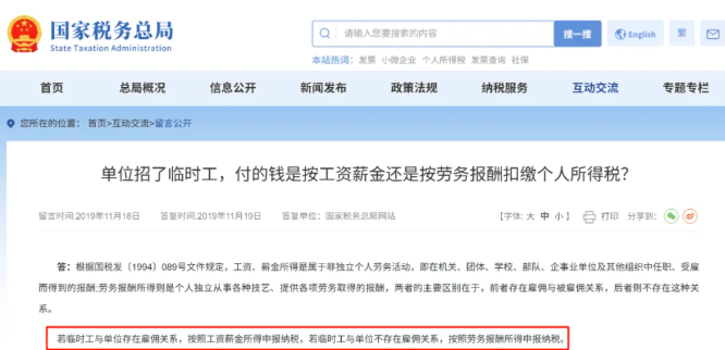 总局官网明确!临时工按工资薪金还是按劳务报酬申报个税关键看这个