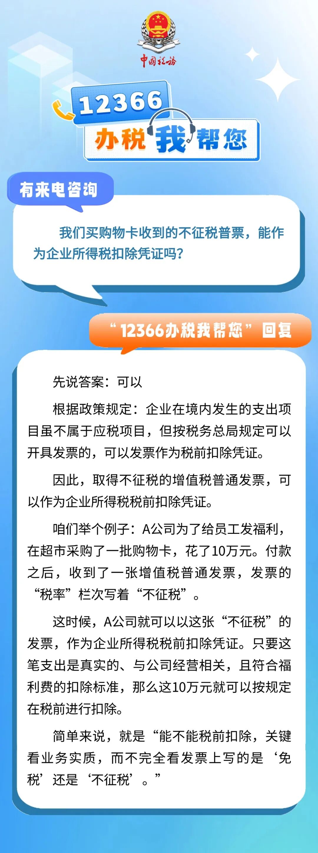 有来电咨询 :我们买购物卡收到的不征税普票,能作为企业所得税扣除凭证吗?一起来看看回复吧↓