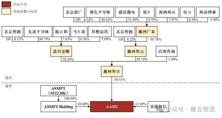 在境外,上市公司发行股份及支付现金收购ASMPT Holding持有的AAMI49.00%股权,在上市公司取得AAMI控制权的同时,AAMI将支付现金回购香港智信持有的AAMI12.49%股权。同时,上市公司向不超35名特定投资者发行股份募集配套资金。