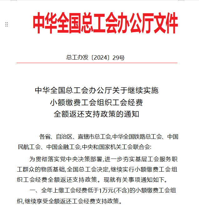 一、全年上缴工会经费低于1万元(不含)的小额缴费工会组织,继续享受全额返还工会经费支持政策。