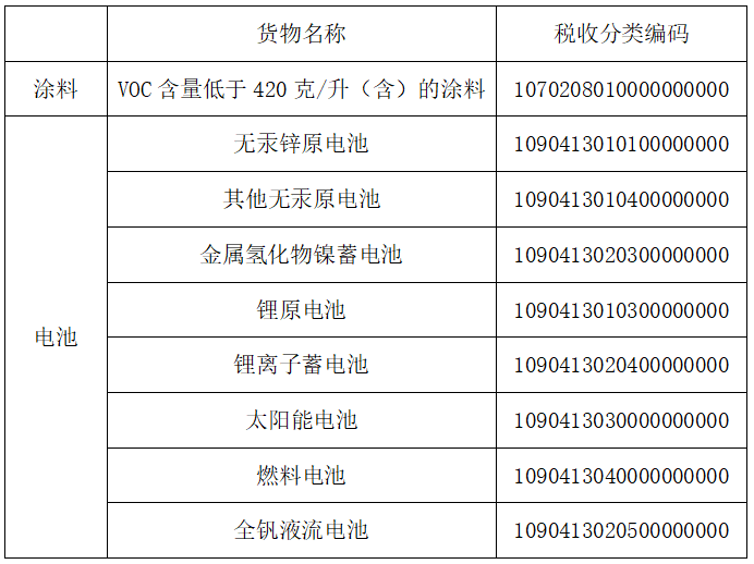 对无汞原电池、金属氢化物镍蓄电池(又称“氢镍蓄电池”或“镍氢蓄电池”)、锂原电池、锂离子蓄电池、太阳能电池、燃料电池和全钒液流电池免征消费税。