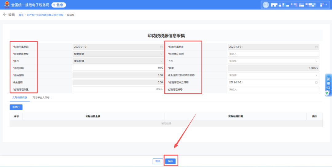 跳转到财产和行为税纳税申报表界面,系统自动带出本期应申报的印花税税种信息。