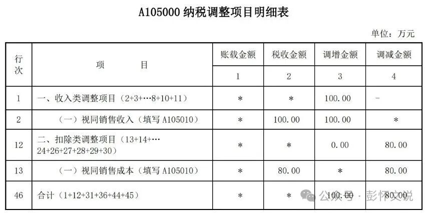 说明:实务中很少会出现视同销售收入与成本为负数的情形。此处只是为了说明该类情况应做的相反调整,实务中都是很多调整事项合计后的结果。