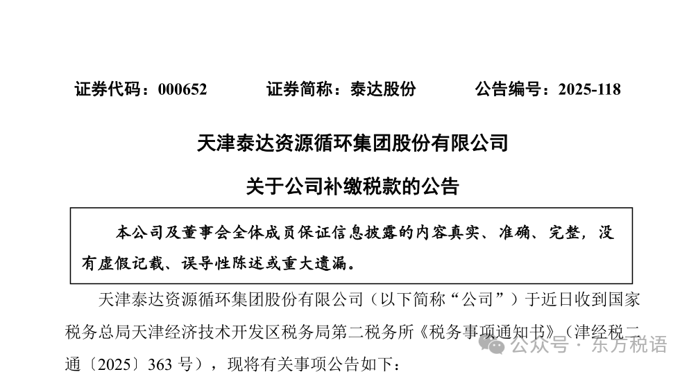 天津泰达资源循环集团股份有限公司(以下简称“公司”)于近日收到国家税务总局天津经济技术开发区税务局第二税务所《税务事项通知书》(津经税二通〔2025〕363 号),现将有关事项公告如下: