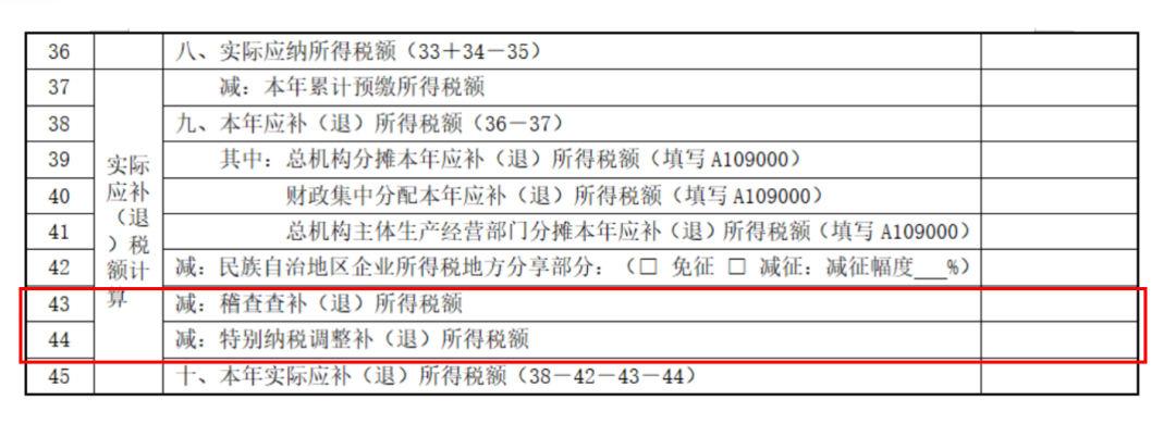第43行“稽查查补(退)所得税额”:填报年度汇算清缴期结束后发生的税款所属期为本年度的稽查查补(退)所得税额。