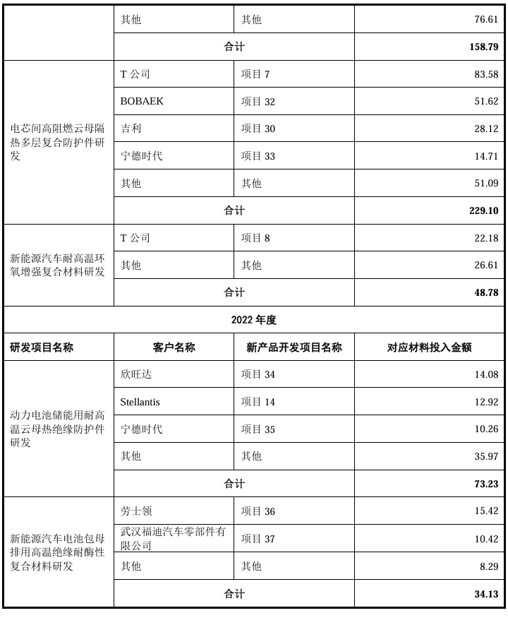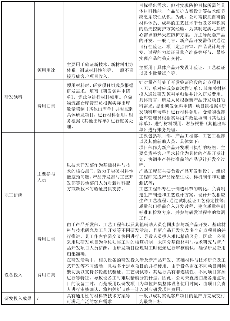 2、结合各新产品开发形成的具体可复用技术、研发前后的核心技术指标差异等,说明新产品开发支出计入研发费用的合理性、相关会计处理是否符合《企业会计准则》的规定报告期内,发行人聚焦新能源汽车动力电池热失控防护材料的技术升级与产品创新,核心围绕耐高温性、抗冲击性及抗撕裂强度等极端工况关键性能指标开展研发工作,以匹配下游客户对电池包安全防护日趋严苛的技术要求。
