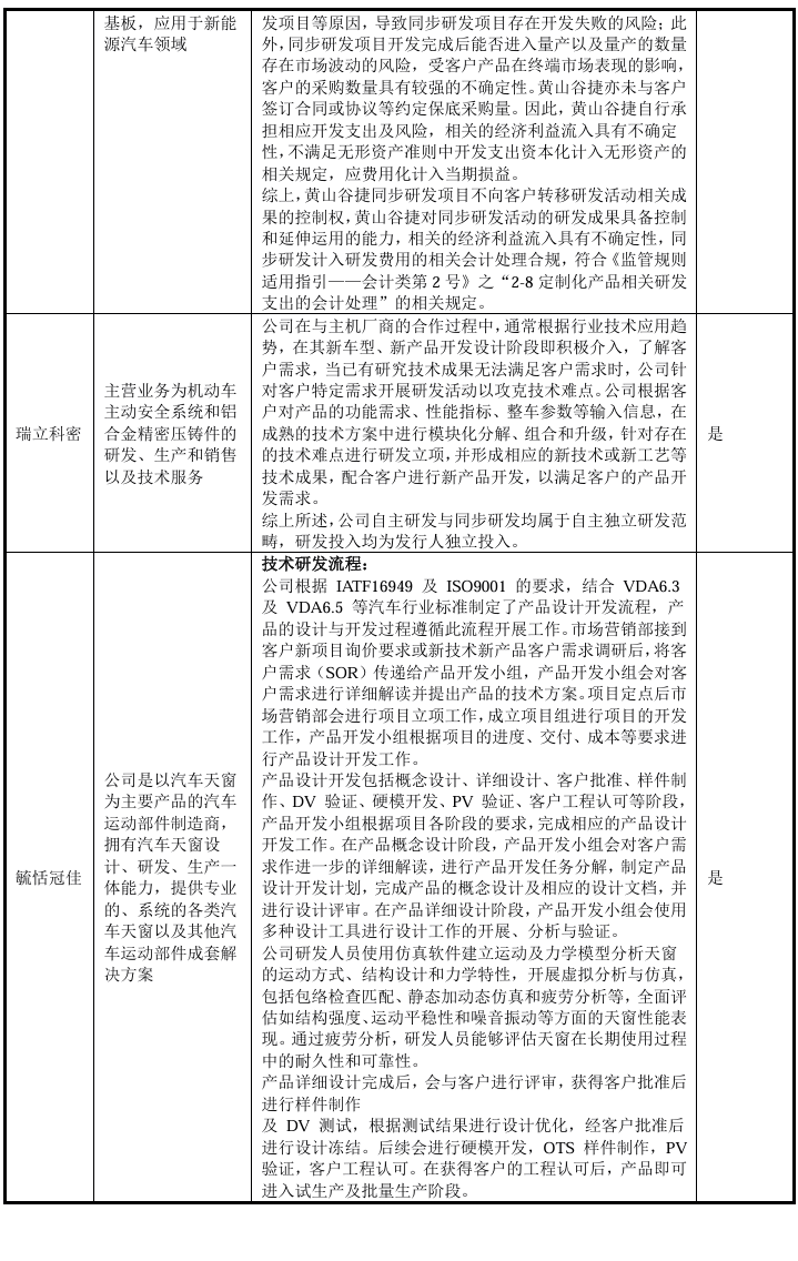 如上表所示,汽车零部件行业内企业普遍存在新产品开发项目的情形,由于汽车零部件企业的新产品开发通常包含大量研究性质的工作,如新材料研发、产品开发、工艺验证、样品试制等,且客户并不承担相应的研发成本,研发项目存在开发失败的风险,将相关开发费用归集计入研发费用系行业通行做法。经对比同行业可比公司会计政策及财务处理实务,发行人对新产品开发费用的核算方法与行业惯例保持一致,不存在重大差异。