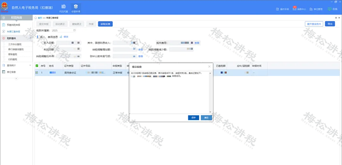 4.确认完毕后,在“应补/退税额”栏中可看到本次应缴/应退税额,上方“收入、费用信息”栏中可看到刚刚填报的收入成本等信息,确认无误后点击上方【提交申报】进行提交,待提示申报成功后即完成申报。
