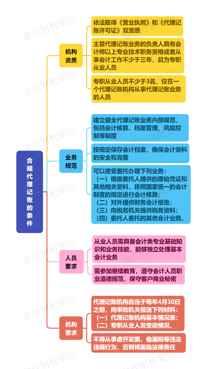 根据《会计法》和财政部令第98号文的相关规定,合规代理记账须满足以下条件: