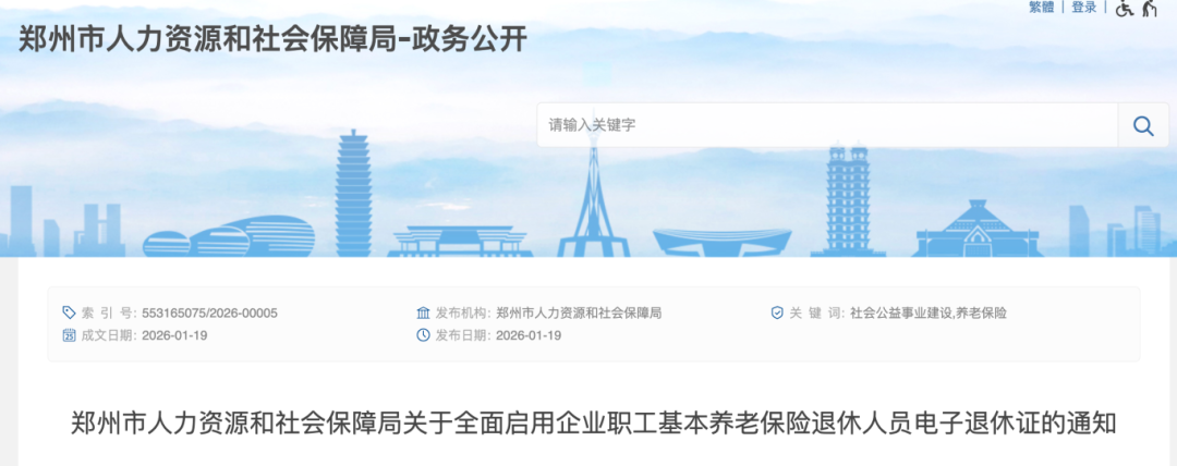 1月19日,郑州市人力资源和社会保障局发布《关于全面启用企业职工基本养老保险退休人员电子退休证的通知》。