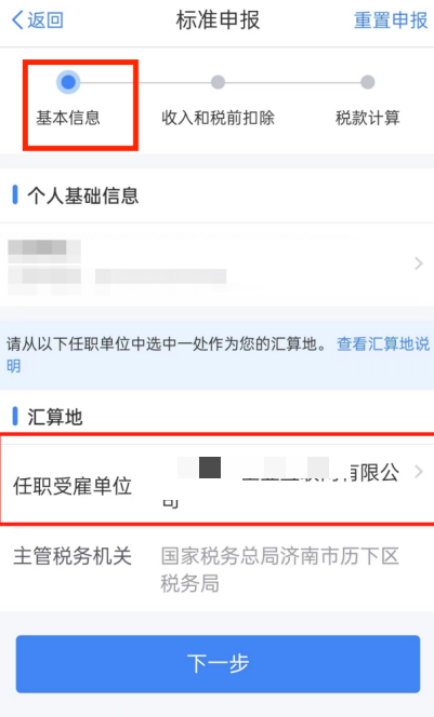 1、进入基本信息界面→核对【个人基础信息】,选择或确认【任职受雇单位】,点击【下一步】,无单位的选主要收入地/户籍地/经常居住地。