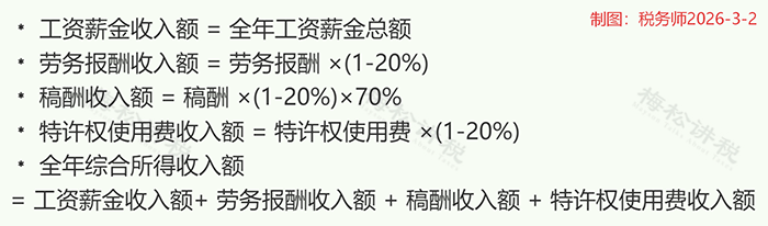 先算出4项收入的全年综合所得收入额: