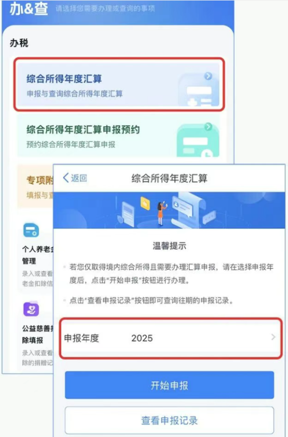 找到【2025 综合所得年度汇算】专题,点击【开始申报】;或在【办 & 查】里点【综合所得年度汇算】,选择申报年度2025。