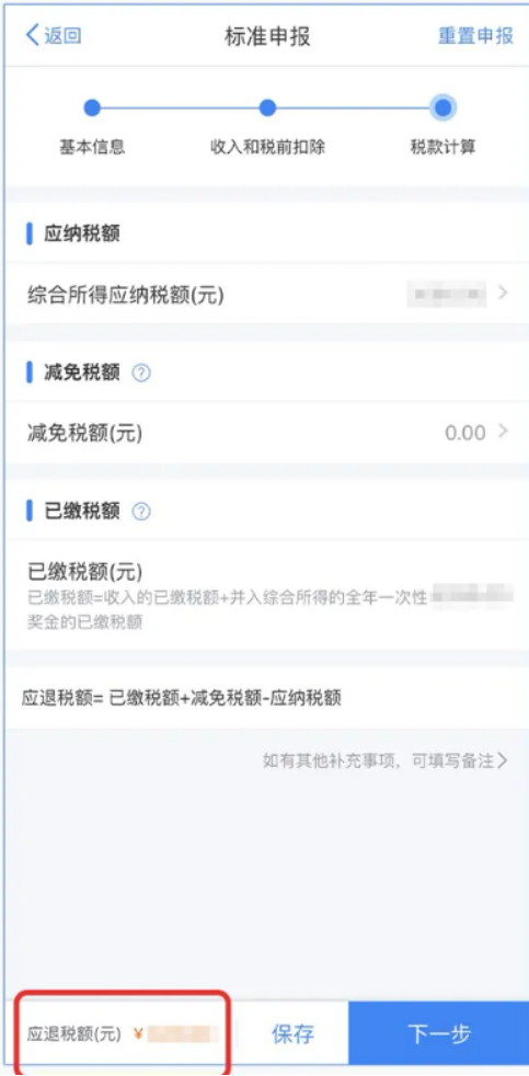 系统会自动计算出【应补税额】或【应退税额】,并在左下方显示,确认金额是否正确,没问题就点【下一步】。